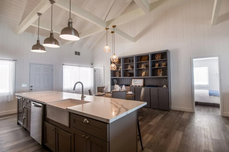 On either side of the main great room are guest bedrooms with bathrooms ensuite and private access to the porch. Interior stairs on either side of the front entrance, lead upstairs to mirrored bunk-bed rooms with their own private bath.